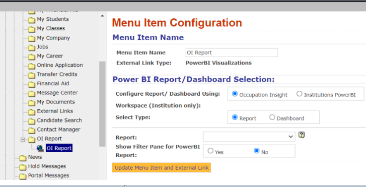 As a Portal administrator, you can create Occupation Insight pages in Portal. Occupation Insight content is derived from Power BI reports and dashboards about market data around specific career fields that are relevant to the students at your institution. The Occupation Insight pages will be integrated into the Portal and will be displayed in the main window to the right side of the menu. Users don't need to navigate through external links to access these pages.