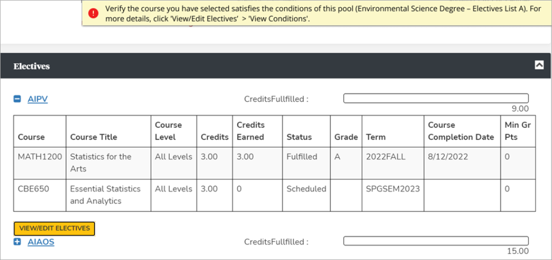 Section Description Program Details Displays the current program, program version, campus, degree pursued, enrollment identifier, academic advisor, GPA, shift, credit required, credits completed, status, enrollment date, expected start date, expected graduation date, and credits. Additional GPAs Displays weighted and unweighted GPA details. Student Academic Progress Displays the credits completed out of credits required. Course Levels Displays the available course levels and associated GPAs. This section is displayed only if the Degree Progress Audit is enabled with the Course Level GPA setting. The method for calculating the Course Level GPA is derived from the program version setting (weighted vs. unweighted). Course Categories/Area(s) of Study Summary Displays all categories in the courses of the program followed by a detailed section for each Course Category and Requirement Rules Summary (if configured). Course List Displays details of the courses in the program. Electives Displays details of elective courses and enables students to view/add courses from the elective pool. The progress bar shows the credits requirement status of the elective pool. If you want to edit the added elective courses, select View/Edit Electives.