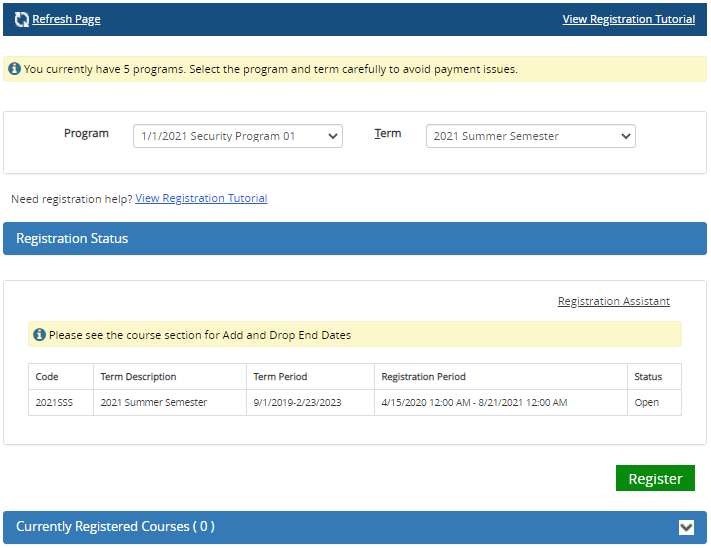 • If you are enrolled in multiple programs, a message is displayed indicating the number of programs you are enrolled in. Select the program for which you want to register classes.