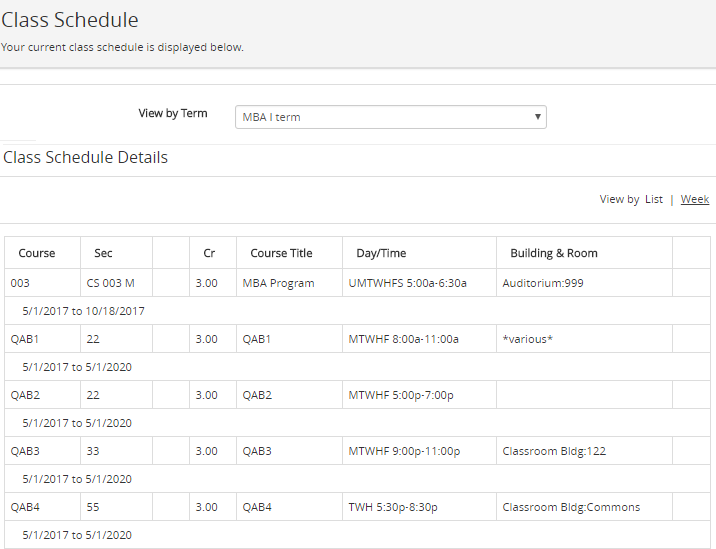 You can view your class schedule for the selected term as a weekly schedule or as a list. The week view provides a calendar grid holding all classes from the term. If the days and times for a course vary by week, the calendar grid adjusts based on the week selected from the week list.