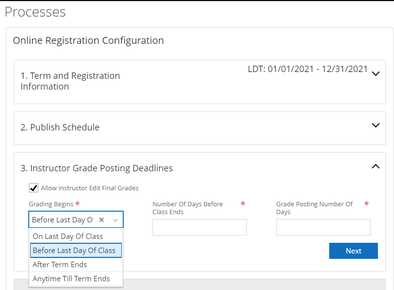 Note: In Anthology Student, you must have enabled the check box for Allow Instructor Edit Final Grades under Instructor Grade Posting Deadlines in the Processes tile > Academic Records > Online Registration Configuration and specify the values accordingly.