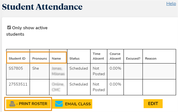 3. Select the Print Roster/Print Enhanced Roster button. The student's name, student ID and preferred pronouns are visible in the printed class roster PDFs.