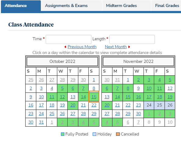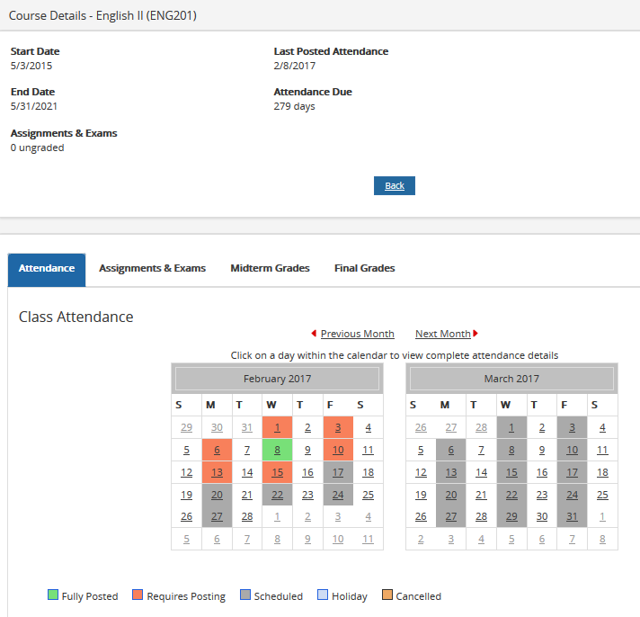 1. Select the Attendance tab on the Course Details page of the selected course. The calendar is displayed. A color code indicates the attendance status. Select Next Month and Previous Month to view the calendar for the next and previous month.