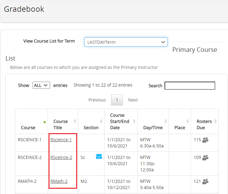 The Primary Course List page displays all courses for which you are assigned as the primary instructor for the selected term.