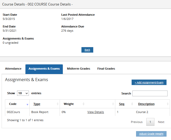 • Select the number in the Post Assign/Exam column. The Course Details page is displayed and the Assignment & Exams tab is selected. See Manage Assignments and Exams.