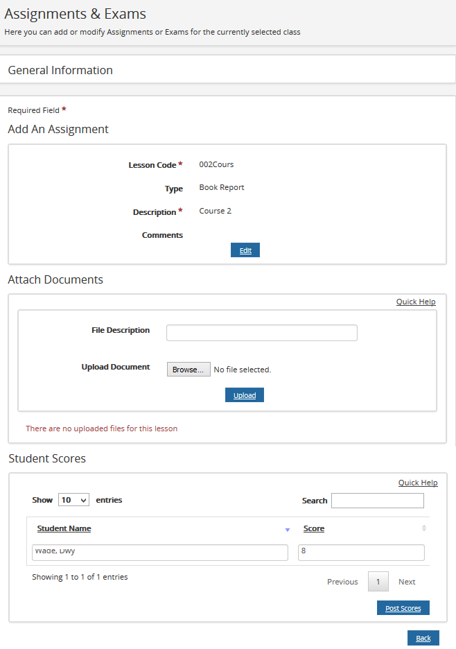 You can add, view, and modify assignments and exams for all your assigned courses from the Course Details page. You can also view and upload documents related to the assignments and exams. The documents will be accessible from the student’s class resources page. You can also configure a percentage weight amount for each lesson that counts towards the student’s final grade. When the lessons are defined, you can return at any point in time and update the scores of the lesson.