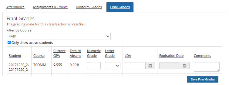 4. If Faculty Portal is configured to display the LDA, Expiration Date, and Comment fields, specify the following details for any student with a failed or incomplete grade: