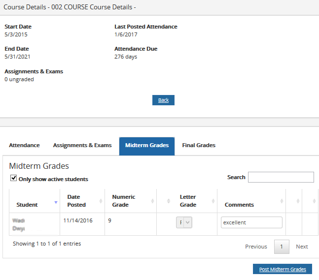 1. Select the Midterm Grades tab on the Course Details page of the selected course. Midterm grades of all active students taking the course are displayed.