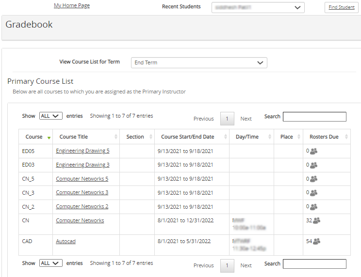 The details of all your assigned courses are displayed in the Gradebook. You can view all the classes assigned to you and all the courses for which you are the primary instructor. Refer to the following procedures: