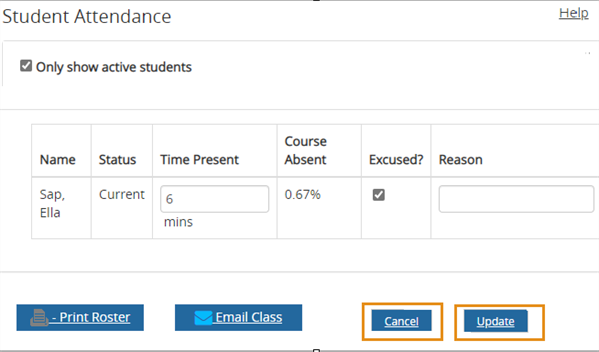 3. Select Edit and enter the attendance as applicable for each student. For example, in the Time Present column enter the minutes present, or select the Excused check box and specify a Reason for the absence.