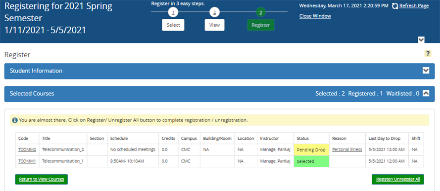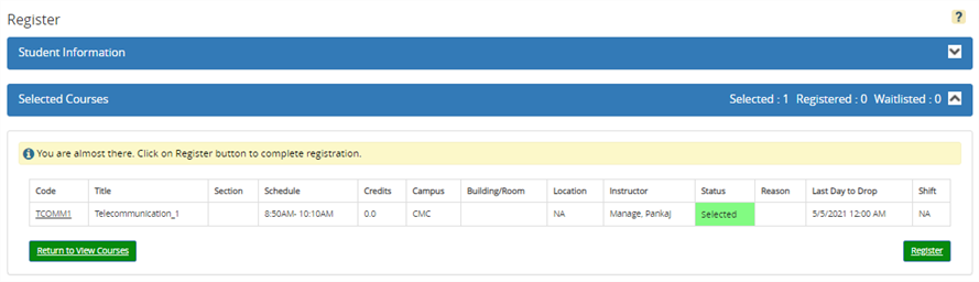 Verify that your course additions and (if applicable) drops are displayed accurately on the page. If necessary, select Return to View Courses to change your selections (see Step 2 - View Courses).