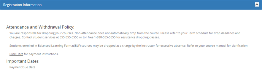 If online payment is configured by the institution, a message similar to the following may appear in the Course Schedule section.