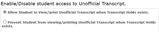 Enable/Disable student access to Unofficial Transcript: Institutions can control the ability of students to view or generate their unofficial transcripts in the Student Portal while being on a transcript hold.