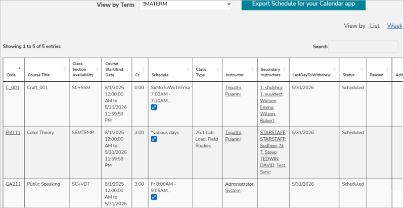 For a specific term, you can view the class schedules and details of the courses that will be conducted. The class schedule is offered in List View and in Calendar View by Weeks.