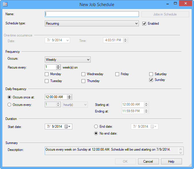 For Schedule Type, select Recurring. Complete the Frequency, Daily Frequency, and Duration groups in the New Job Schedule window.