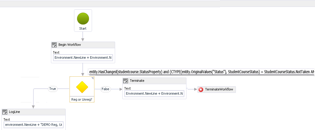In our example, the FlowDecision activity contains a condition that checks whether the StudentCourse.StatusProperty entity has changed, and whether the original Status value was NotTaken (case a), Registered (case b), or CurrentlyAttending (case c). The CTYPE function changes the original Status values to a new Status values for each case.