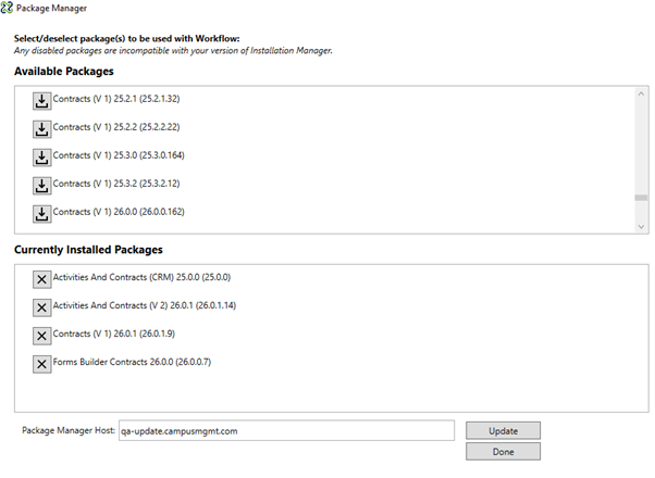 for the package to install. A progress bar is displayed while the selected package is being downloaded and extracted to the appropriate location. When the installation is complete, select Done to close Package Manager.You can install only one version of a specific package type. For example, if you installed "Activities and Contracts (CRM) 12.0.0", you cannot have "Activities and Contracts (CRM) 13.0.0" on the same instance of Workflow Composer at the same time. "Activities and Contracts (CRM) 13.0.0" will overwrite "Activities and Contracts (CRM) 12.0.0".