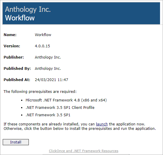 Workflow Composer is deployed via a ClickOnce application that allows self-updating Windows-based applications to be installed and run with minimal user interaction. You can install Workflow Composer with one click on the Install button or launch it from a website.