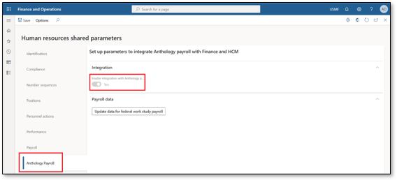 Expand the Integration FastTab and set the Enable integration with Anthology Payroll field to Yes.
