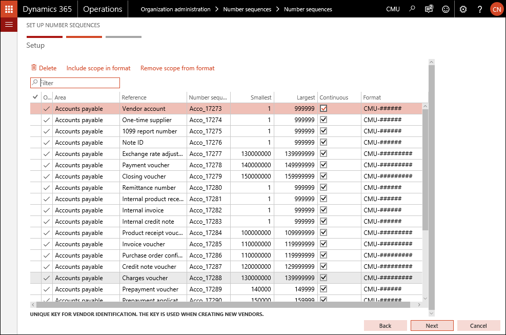 To add or remove a scope segment to the format of a number sequence, select the number sequence record and click Include scope in format or Remove scope from format option available at the top of the screen.