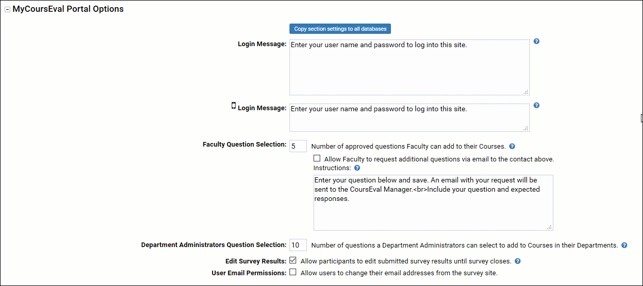 NOTE: These settings can be copied to all the databases in the Course Evaluations instance if needed.