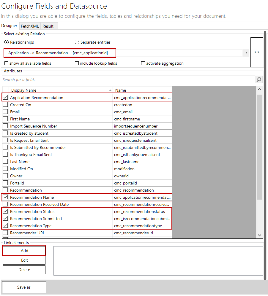 In the Select existing Relation area, select Application > Recommendation and select the following fields:
