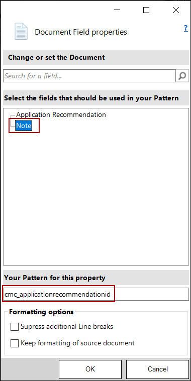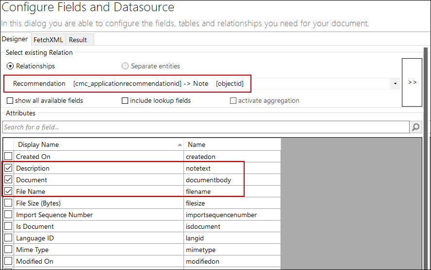In the Select existing Relation area, select the Recommendation > Note relationship and select the following fields: