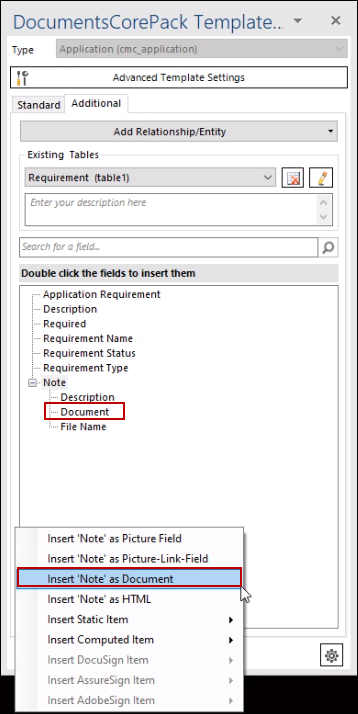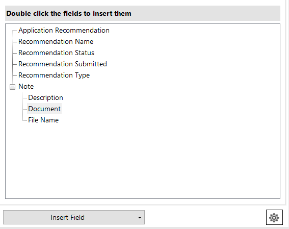 Under the Note field, select Document, click the Insert Field drop-down, and select: