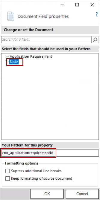 In the Document Field properties, double-click Note.