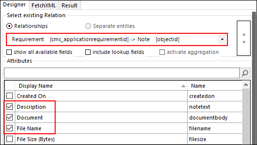 In the Select existing Relation area, select the Requirement > Note relationship and select the following fields: