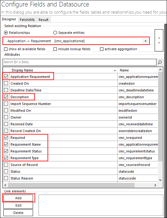 In the Select existing Relation area, select Application > Requirement and select the following fields: