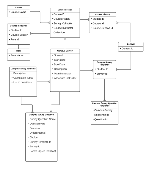 The following diagram illustrates the entities relationship for the Campus Survey feature.