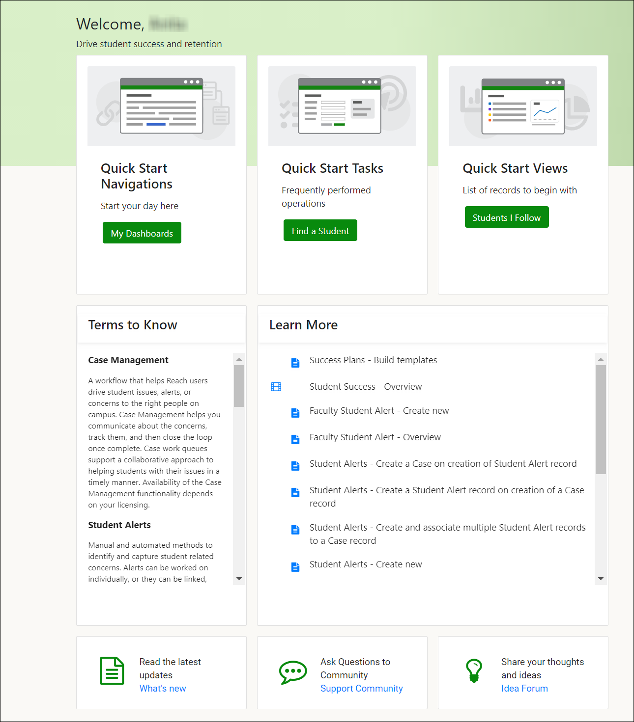 The Get Started page (under Reach > Student Success) provides an easy to use starting point for users to work with the Student Success feature in Anthology Reach. The resources and navigation links on the Get Started page makes it easier for users to learn the functionality and to access the required resources easily with less number of clicks.