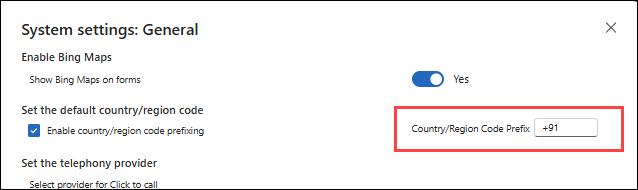 In the System settings: General dialog box, specify the required country code in the Country/Region Code Prefix field.