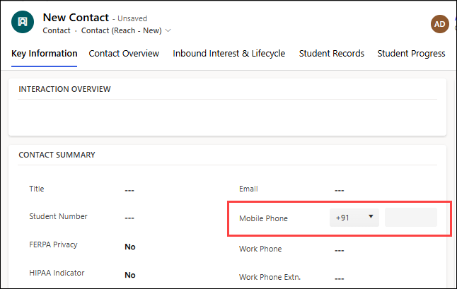 Anthology Reach includes a PCF control, Phone Number Display Control, for phone number formatting. This control is pre-enabled and applied to the Mobile Phone field in the Contact (Reach - New) form. It allows users to select a country code from a drop-down while entering phone numbers, thus minimizing errors.