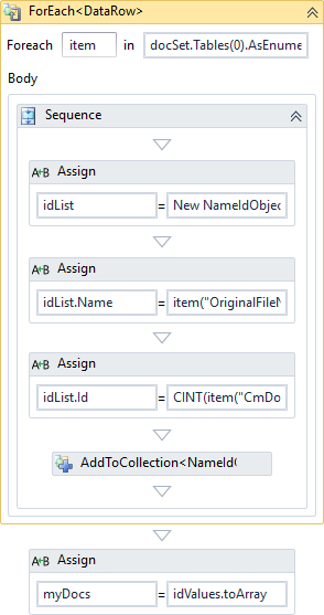 The final Assign activity assigns the document Id values to the myDocs argument.