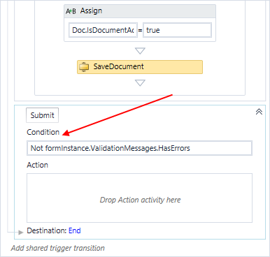 In the Condition field of the Submit transition, specify the following (to prevent users from submitting a form that has validation errors): Not formInstance.ValidationMessages.Has Errors