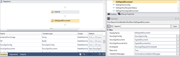 Create a variable named DocuSignFormData. In the Variable type field, select the List Collection (system.collection.Generic.List<T>) and inside the List select the DocuSignFormDataitem Entity(Cmc.Nexus.FormsBuilder.Entities.DocuSignFormDataitem.). Set the Scope to StateMachine.