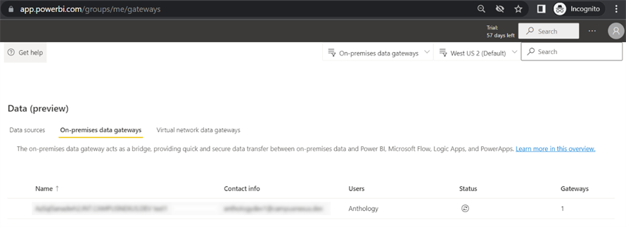 Log into https://app.powerbi.com/ with the Microsoft Power BI account used to register the gateway to verify the gateway has been added.