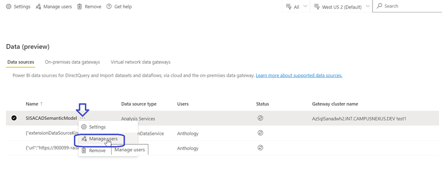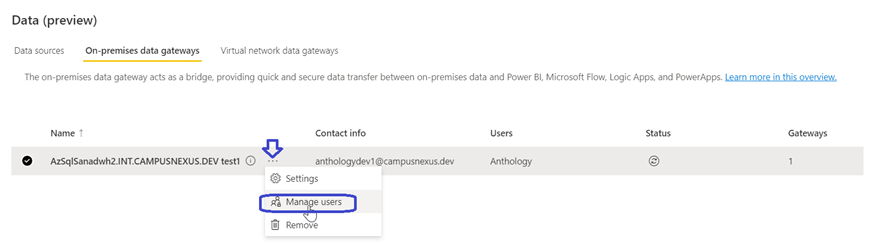 Select the Gateway that was created for Analysis Services. Click options (...) and select Manage users.