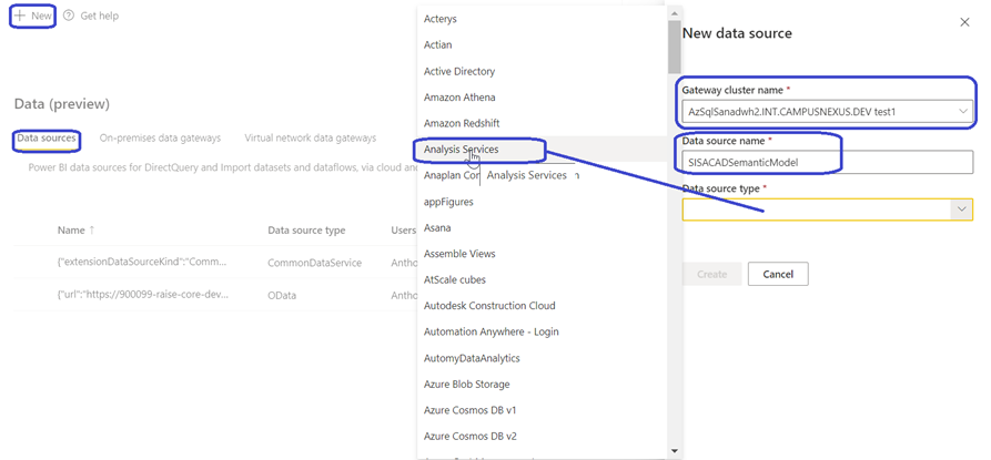 Select Gateway cluster name, add Data source name, and select Analysis Service.