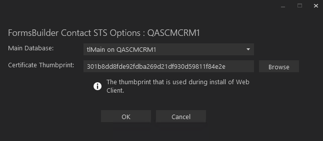 The same certificate thumbprint that is used on the Staff STS must be used here. Copy and paste the thumbprint from the Staff STS into this field, or click Browse to navigate to the IIS Server Certificates to select the thumbprint. The thumbprint is added to the Designer web.config file. Closed