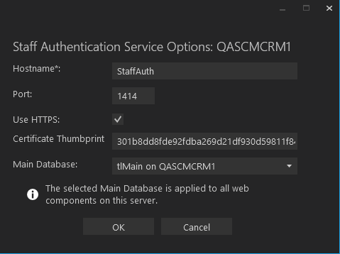 Use HTTPS Select this check box if you want the Staff Authentication Service to be accessed through HTTPS. When this option is selected, the Certificate Thumbprint field is enabled.