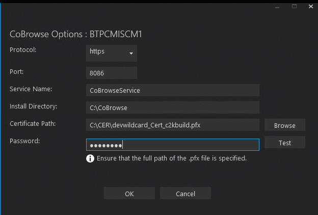 Certificate Path Provide the full .pfx file path. The file format must be .pfx.
