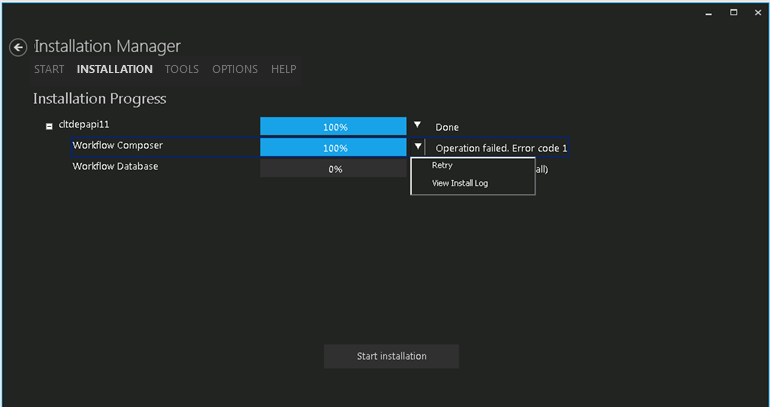 If an error occurs while installing one or more components, select the Retry option on the component's context menu. The installation of failed and new components resumes. Successfully installed components are skipped.