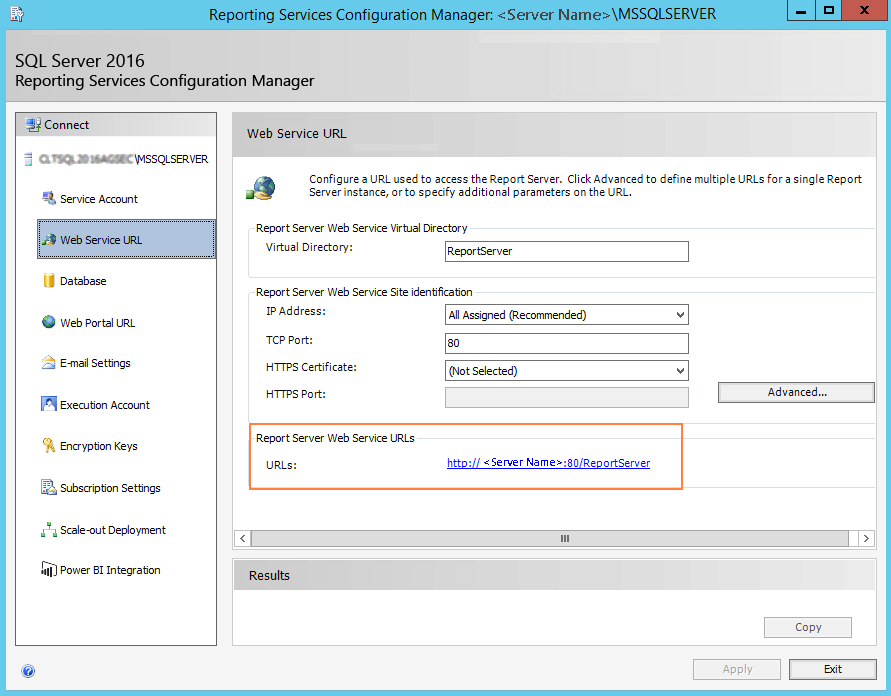Specify the Web Service URL configured to access the Report Server. The specified URL will be stored in the web.config file. This URL is set while configuring the reporting service and can be found in Reporting Services Configuration Manager.