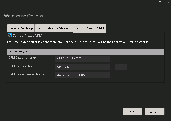 Student Database Name Name of the Anthology Student database used by Student Analytics. Click Test to verify access to the database. Student Catalog Project Name Name of the Anthology Student Catalog Project which holds the SSIS packages, for example, Analytics - ETL - SIS. Warehouse Options - CampusNexus CRM Tab Field Description CampusNexus CRM Select this check box if the source database is a CampusNexus CRM database. The associated fields are enabled. CRM Database Server Name of the CampusNexus CRM database server used by Analytics. CRM Database Name Name of the CampusNexus CRM database used by Analytics. In most cases this will be the application's main database. Click Test to verify access to the database. CRM Catalog Project Name Name of the CampusNexus CRM Catalog Project which holds the SSIS packages, for example, Analytics - ETL - CRM. -