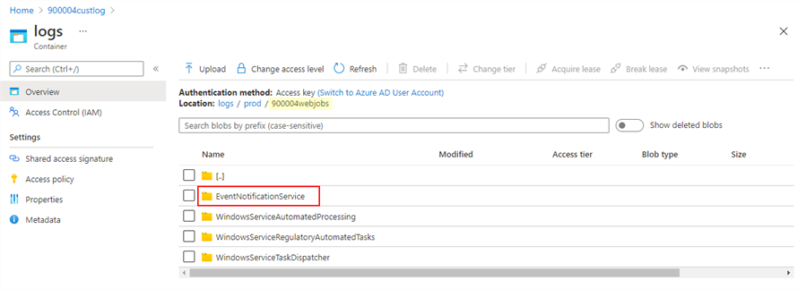 For workflow logs, select the <your subscription>webjobs folder and then select EventNotificationService.