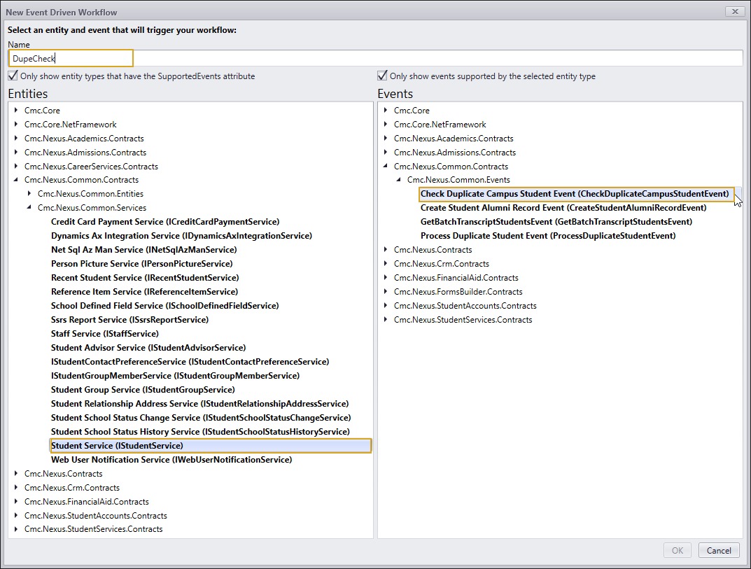 To find available services, in Workflow Composer click New Event Workflow and select a service in the Entities pane. The bold text in the Events pane indicates the events supported by a selected service, for example, CheckDuplicateCampusStudentEvent. When called via the GetServiceInstance activity, the CheckDuplicateCampusStudentEvent becomes the CheckDuplicateCampusStudent method call on the iStudentService in the workflow. This screenshot shows how to find all available service methods.